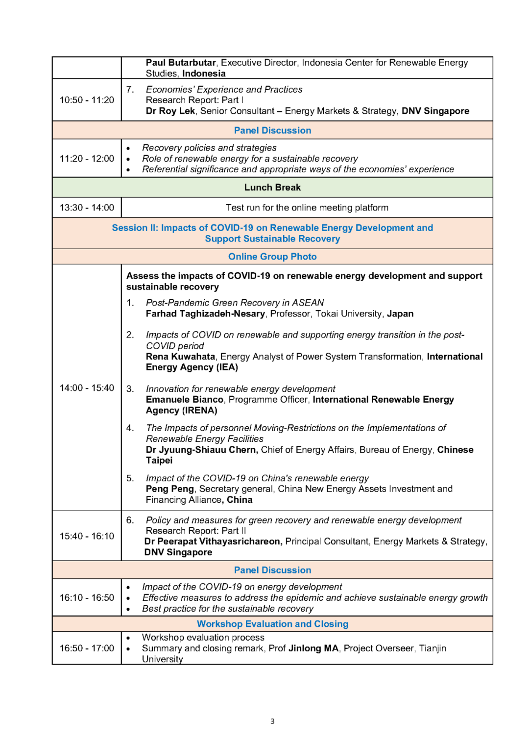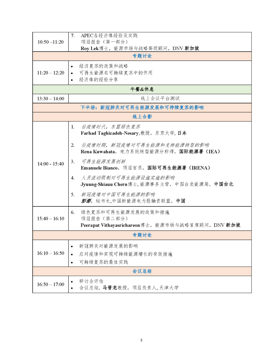 研讨会现已邀请来自国际可再生能源署(IRENA)和国际能源署(IEA)等国际组织,国内外政府官员、项目开发商、研究机构以及高等院校和研究机构的专家学者就经济复苏过程中如何支持可再生能源发展进行信息交流和经验分享。截至目前,共收到了来自美国、澳大利亚、日本、新加坡、中国香港、中国台北、泰国、印度尼西亚、马来西亚、越南、秘鲁、中国等12个APEC经济体的参会报名。