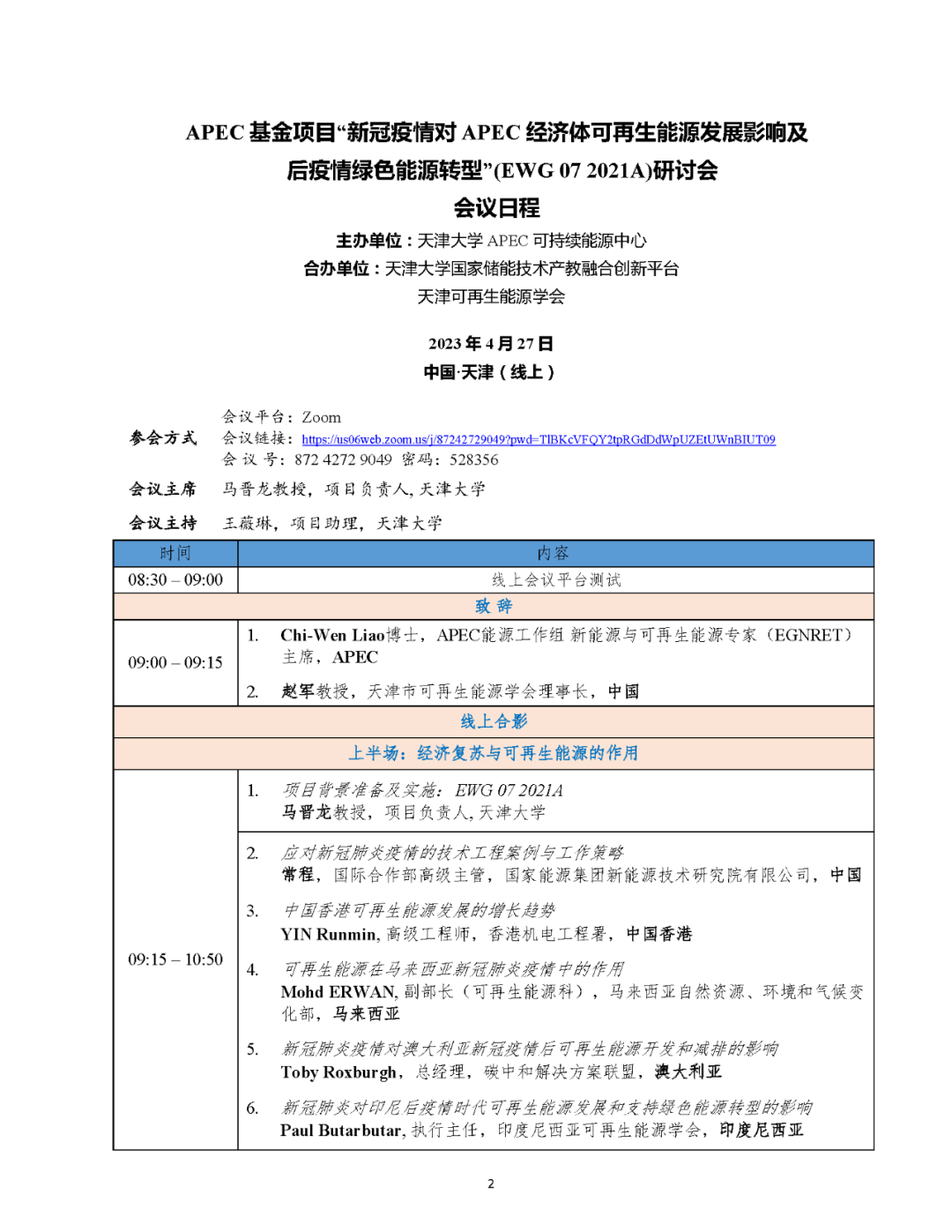 此次研讨会是APEC基金项目“新冠疫情对APEC经济体可再生能源发展影响”(EWG 07 2021A)的重要活动之一。该项目由中国于2021年组织、准备和申报,获得中国香港、泰国、新加坡、马来西亚四个共提经济体的支持。项目由天津大学APEC可持续能源中心(APSEC)负责,项目负责人为马晋龙教授。APSEC能源转型方案研究组(ETS)联合DNV(新加坡)共同实施,项目的主要任务包括组织开展相关研究、组织项目研讨会、开展疫后绿色能源转型的能力建设和经验分享。